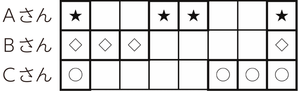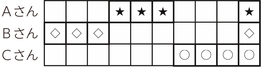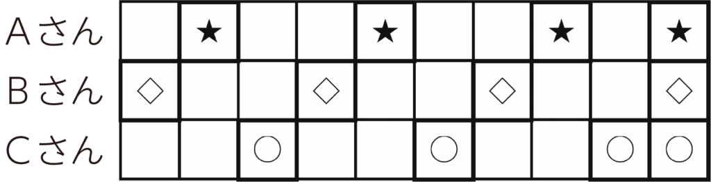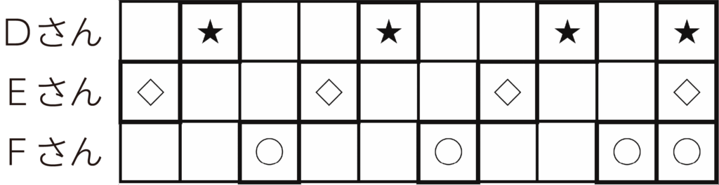 三人の組合せを3回くり返す。最後は一斉に鳴らす。