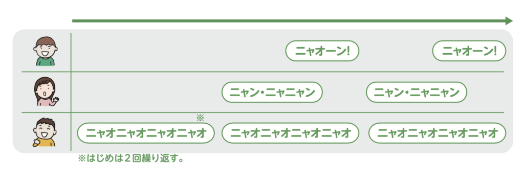 <ねこの鳴き声を使った三人の組の表現例>